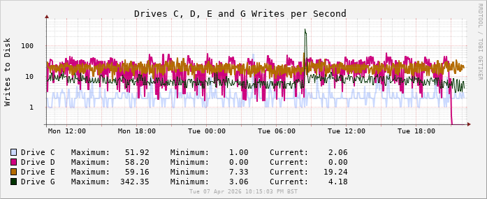 Atlas Storage Disks C:\ D:\ E:\ & G:\ - Writes to Disk Per Second